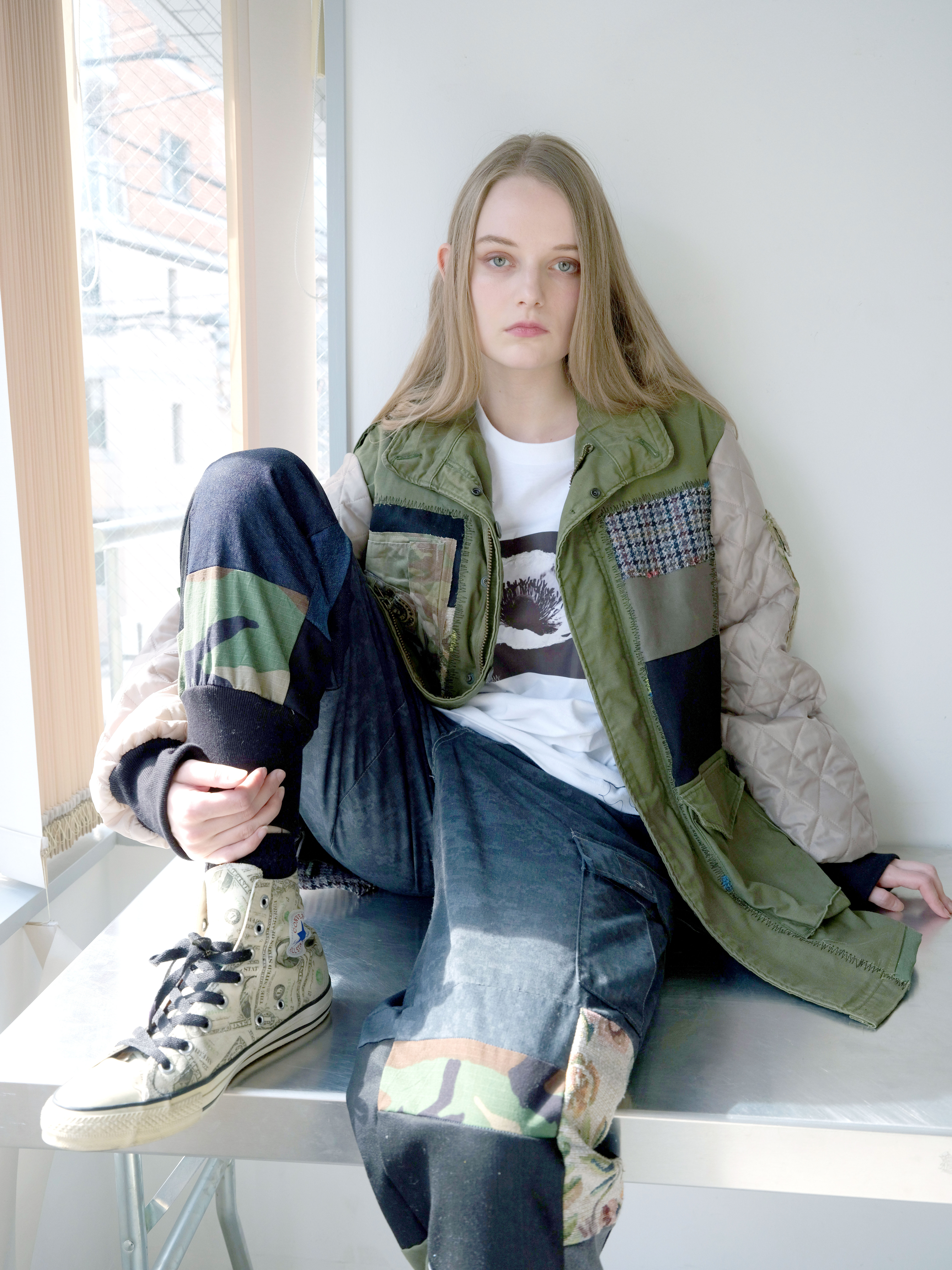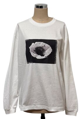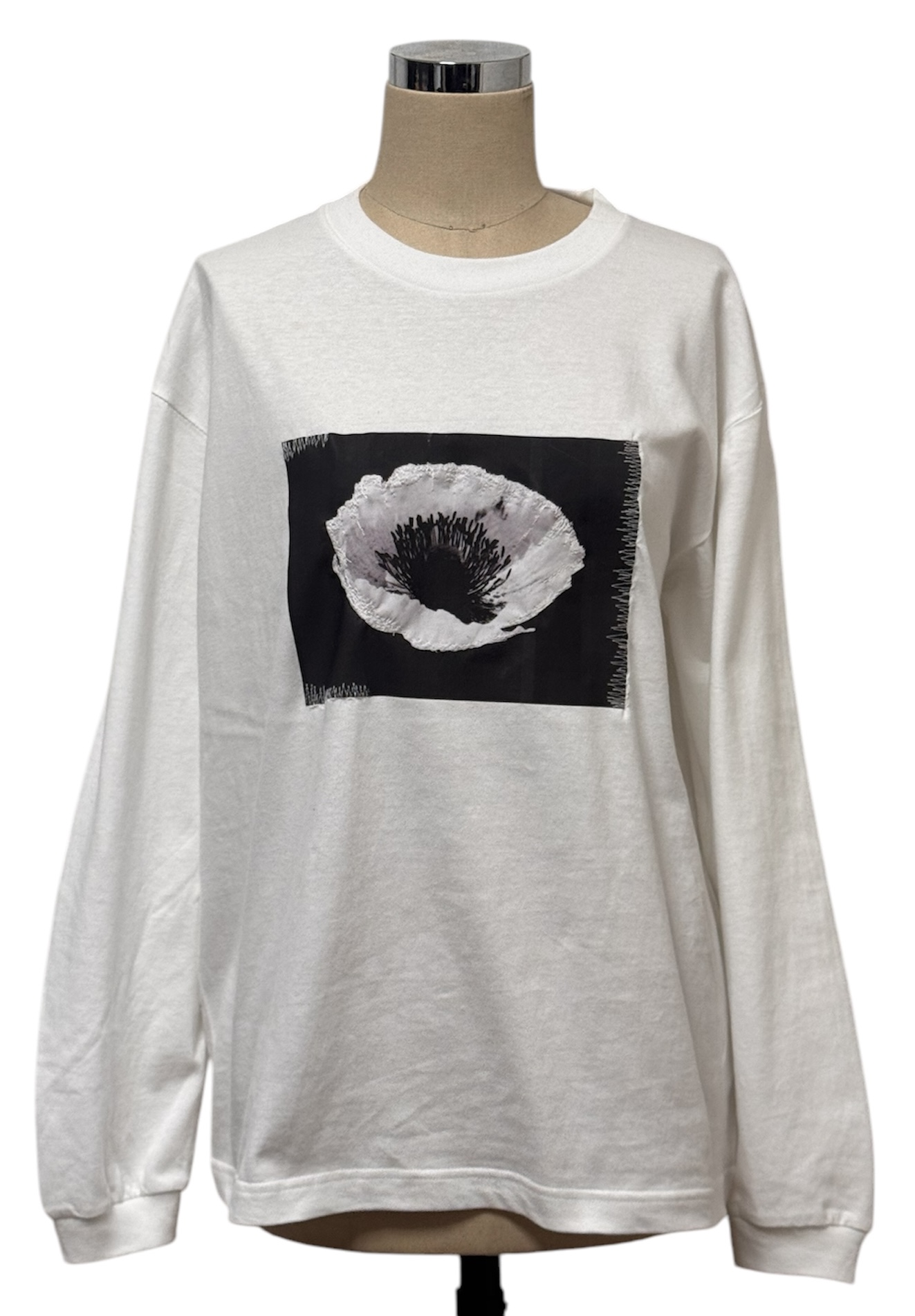 以黑白花卉照片为基础,辅以自由刺绣装饰的长袖T恤。