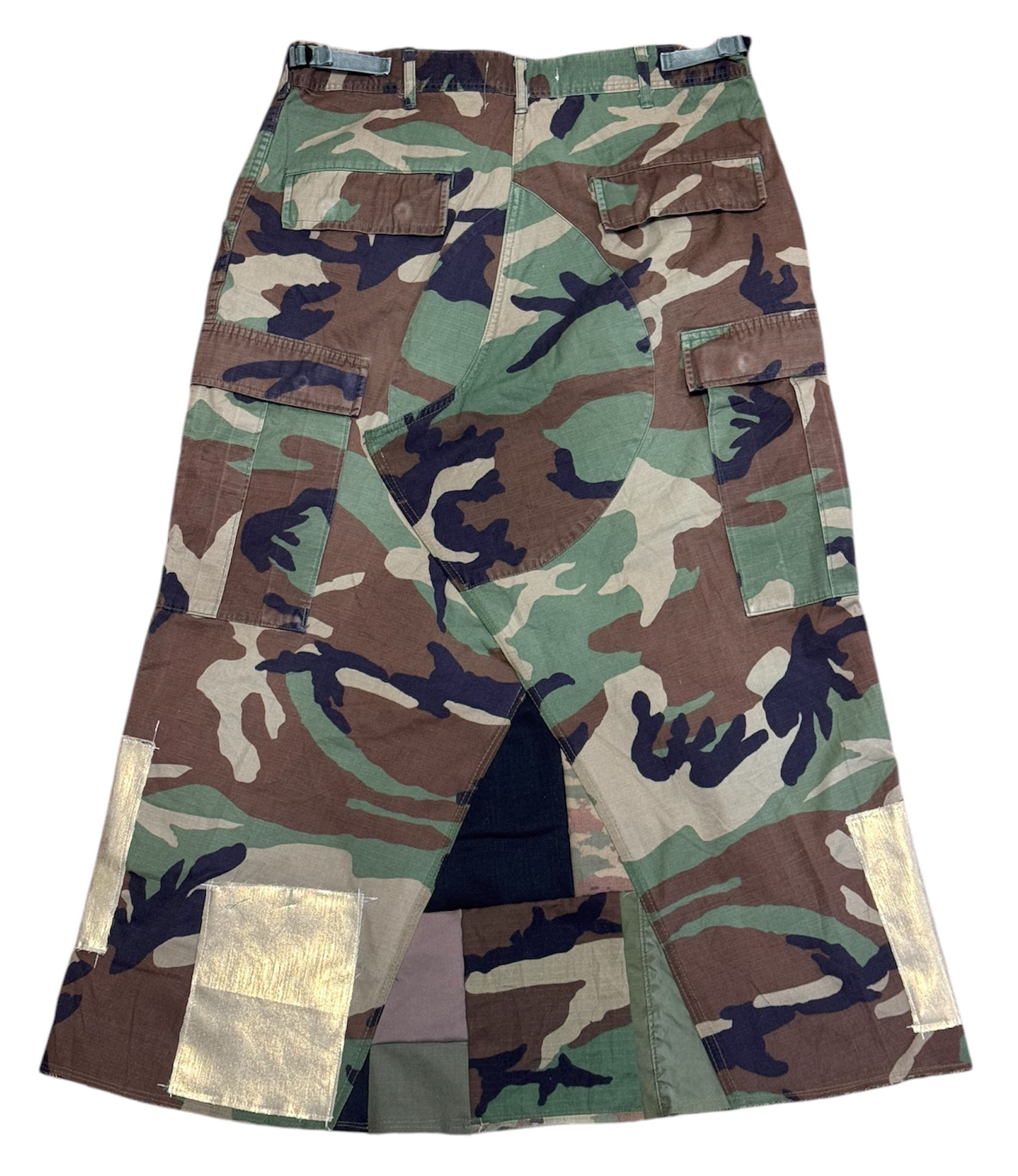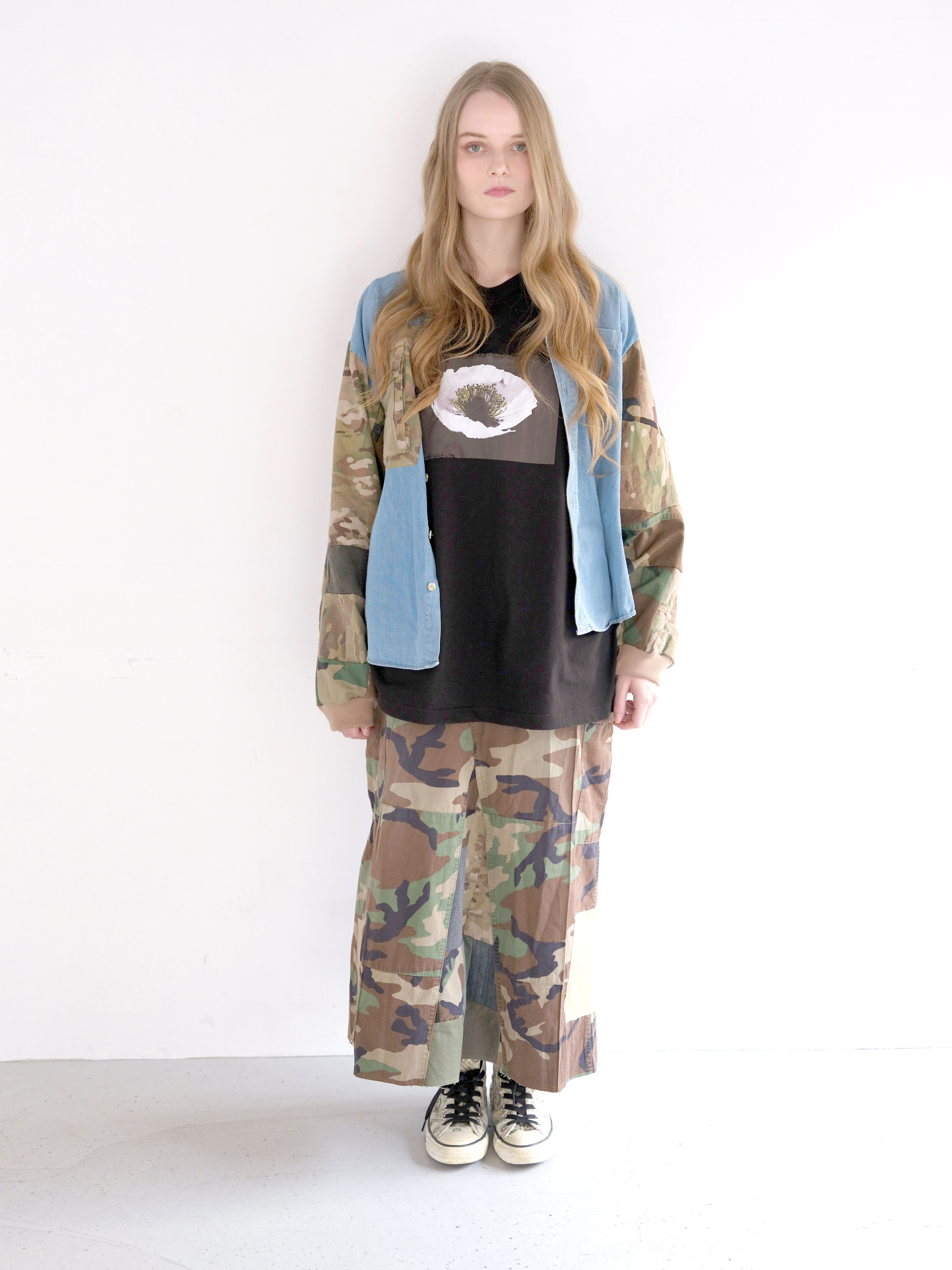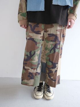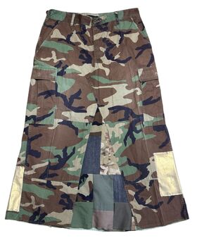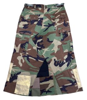 将伍德兰迷彩裤拆解并改造而成的半身裙。拼贴设计为随机搭配,每款独一无二。