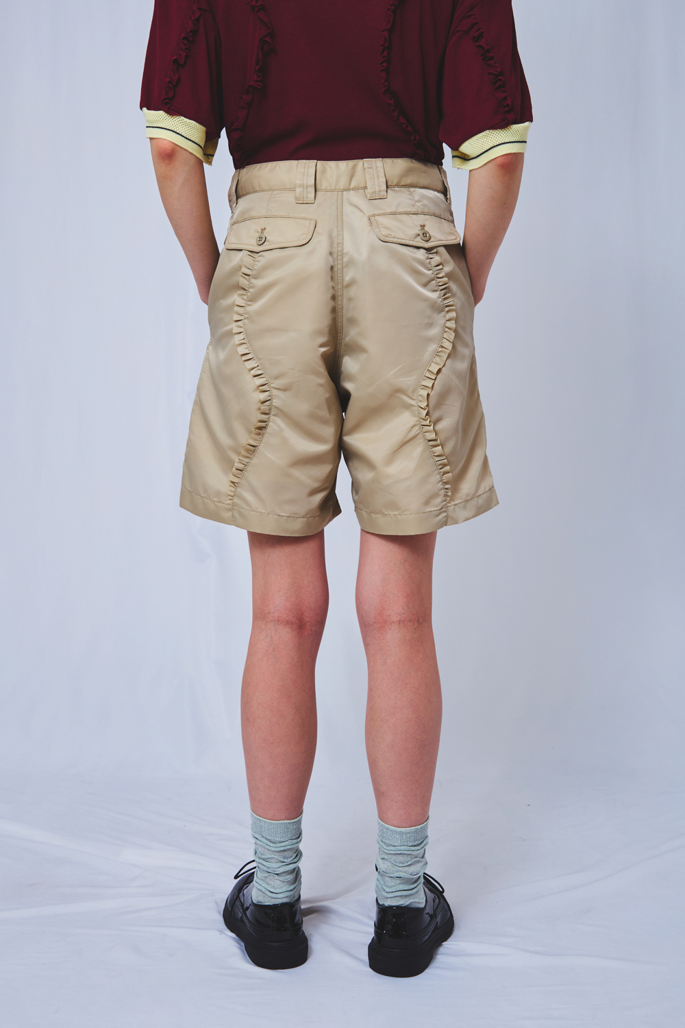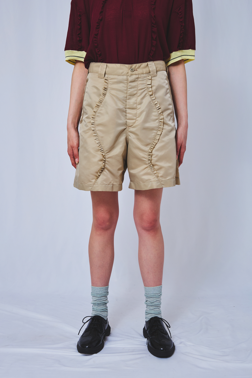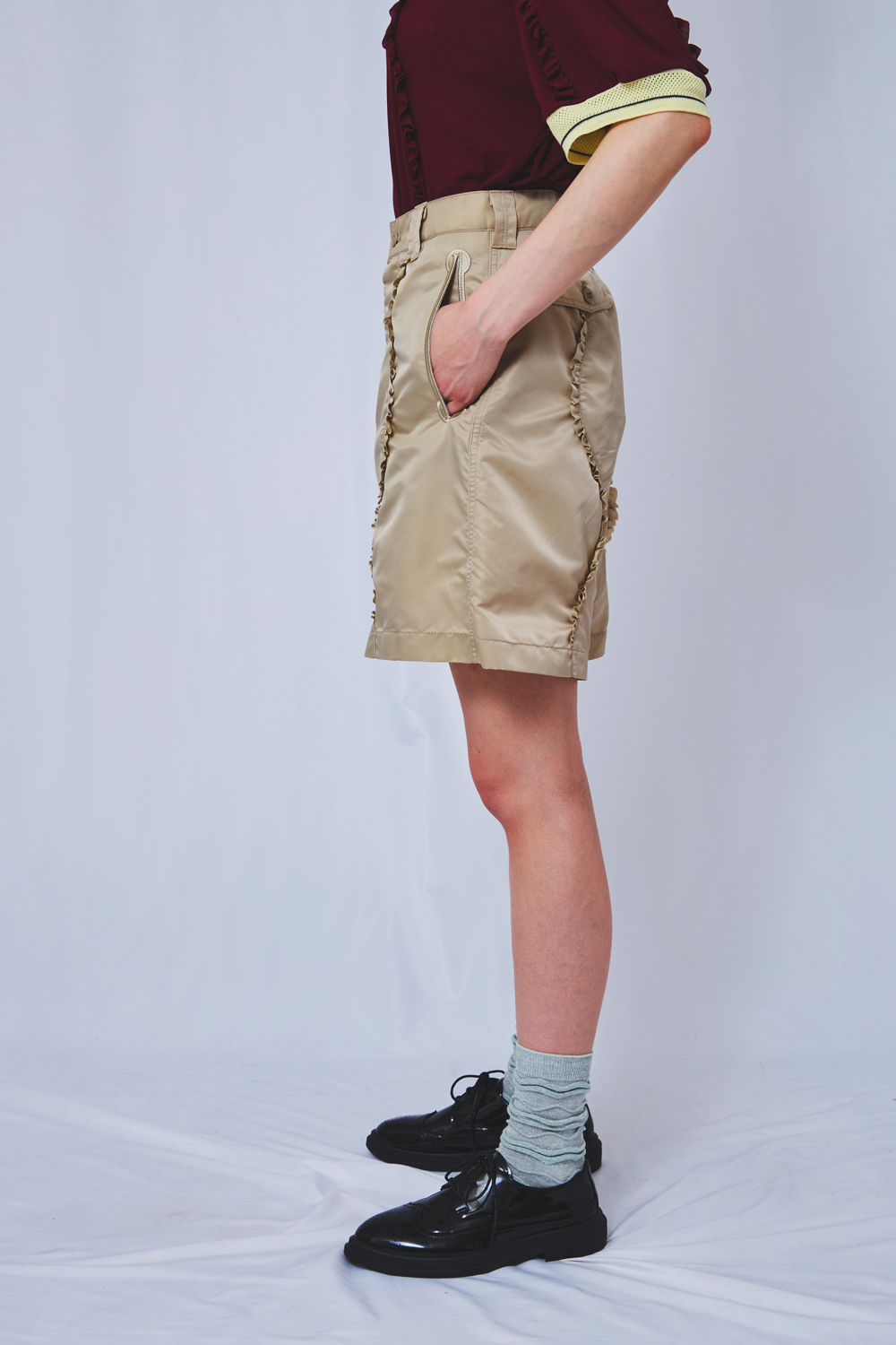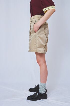 撥水加工を施したミリタリーナイロンを用い、フレンチショーツを再構築。 テーマ性を映し出すウェーブカットに、繊細なフリルを重ねることで、 アートの気配とともに躍動感あふれるデザインへと昇華しました。 素材:Nylon 100% 裏地 Polyester 100% サイズオプション(モデル身長:175cm)
